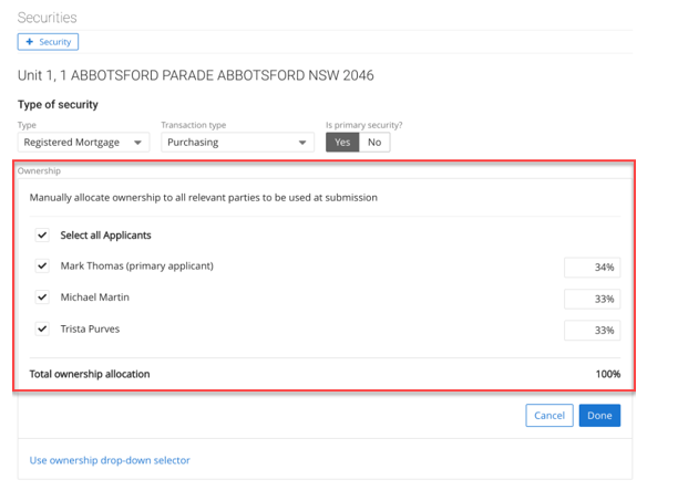 The summary view has been refined to display a clear breakdown of ownership as soon as the data is saved. This high-visibility layout makes it easy to quickly confirm that ownership is allocated correctly before lodging the application.